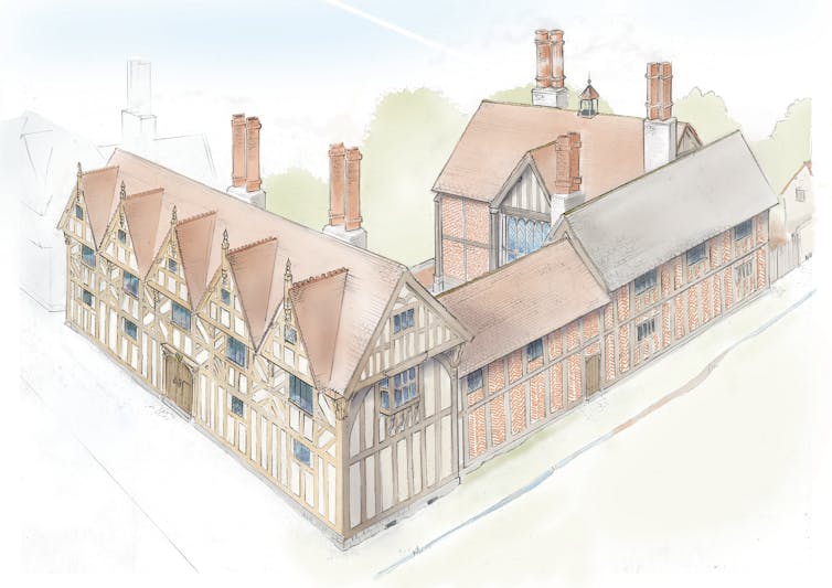 The building itself was lost in the 18th century, but the site and its remains were preserved beneath a garden. Erected in the centre of Stratford-upon-Avon more than a century prior to Shakespeare’s purchase in 1597, from its inception, it was architecturally striking. One of the largest domestic residences in Stratford, it was the only courtyard-style, open-hall house within the town.